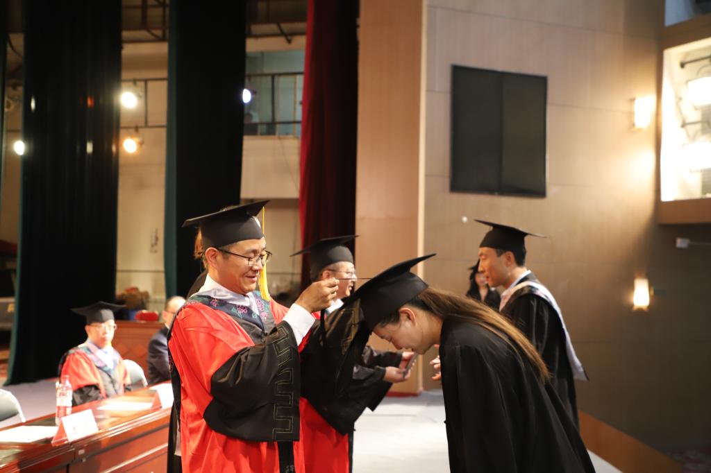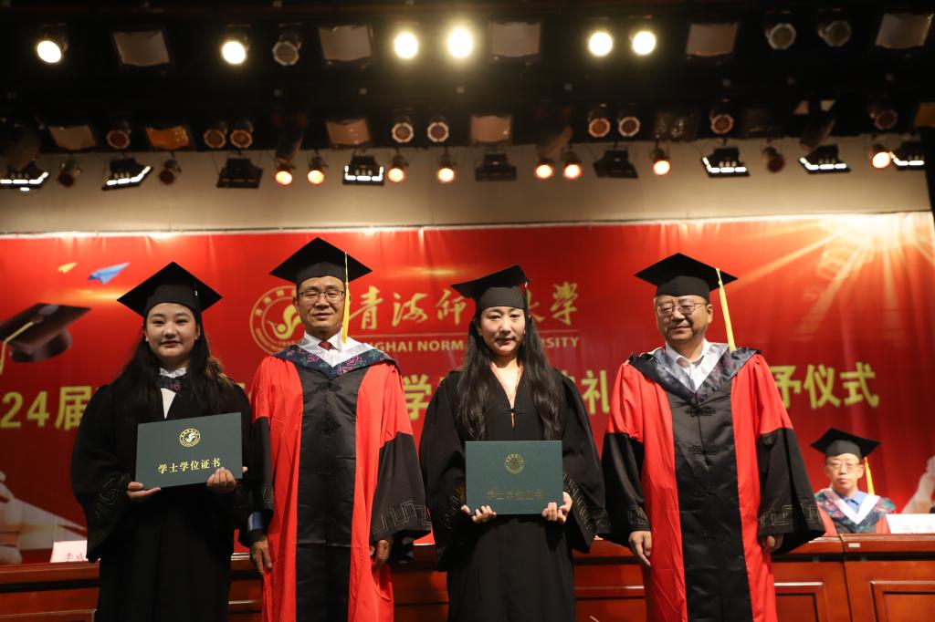 典礼上分别宣读了关于准予毕业、授予学位、表彰优秀学生和优秀班干部等文件。侯广彦、李成林分别为优秀学生代表和优秀班干部获得者颁奖。学校学位评定委员会委员曹广超、李合成为2024届高等学历继续教育获得学士学位的同学们行拨穗礼,颁授学士学位证书。
