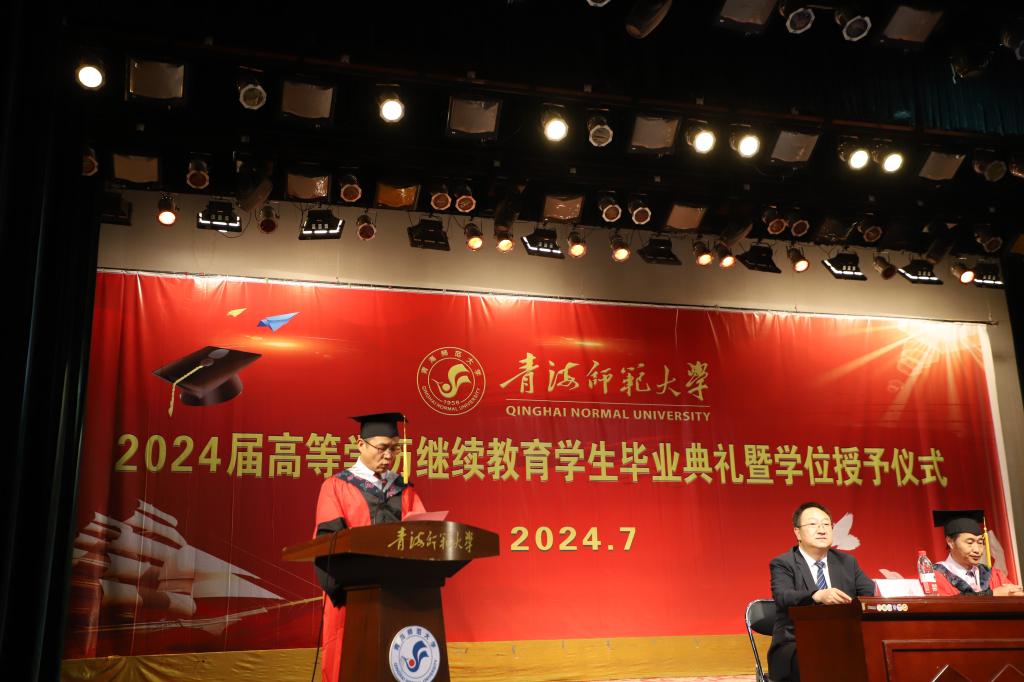曹广超作了《青春不老 未来可期》的致词,在致词中代表学校向各位毕业生表示热烈的祝贺和美好的祝愿,向所有为学生成长付出辛劳、默默奉献的老师和家长致以衷心的感谢和崇高的敬意。他殷切寄语2024届高等学历继续教育毕业生要正确认识时代责任和历史使命,把远大抱负落实到实际行动中,脚踏实地,做一名敢于有梦、勤于圆梦的有志者;要珍惜韶华,勤于学习新知识,善于钻研新问题,勇于接受新理念的有才者;要从小事做起,从基层做起,从细节做起,干一行、爱一行、精一行,做一名躬身实践、崇尚实干的有为者。