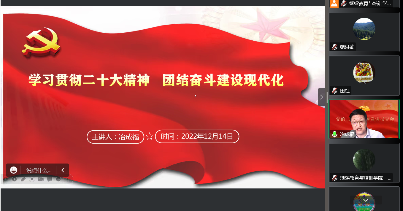 为深入学习贯彻落实党的二十大精神,根据学校统一部署,12月14日下午,学校党的二十大精神领导干部巡讲团成员冶成福副校长为继续教育与培训学院、数学与统计学院、附属玉树实验学校、教务处作了党的二十大精神的宣讲报告。报告会由继续教育与培训学院副书记李芹主持。